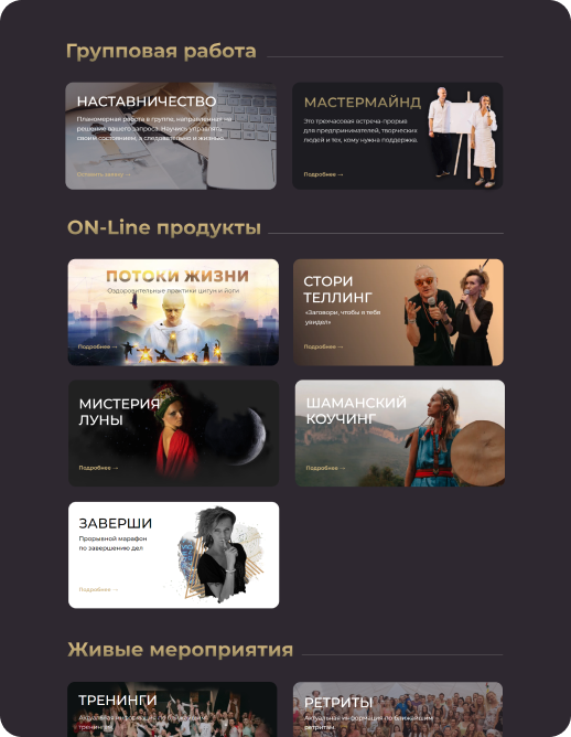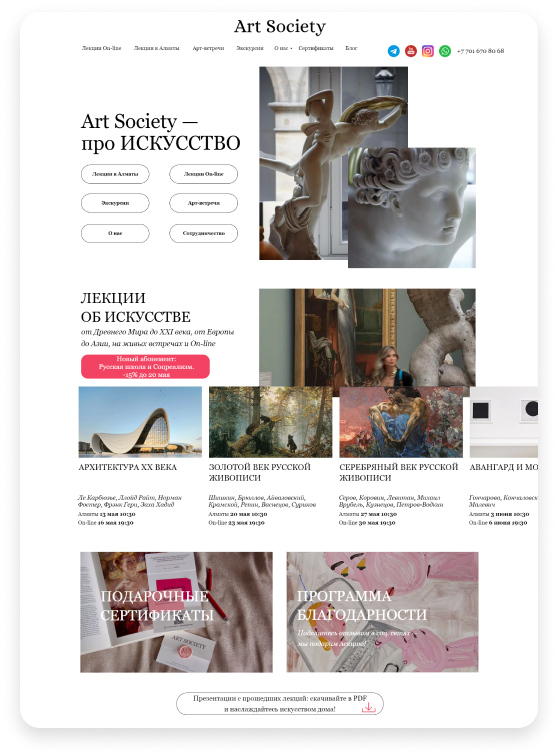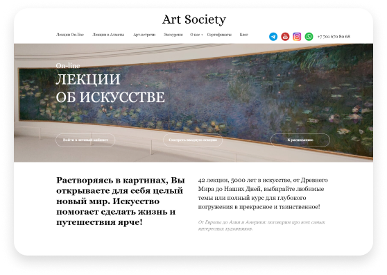 Многостраничный сайт (порядка 250 страниц): проект об искусствах с расписанием мероприятий, онлайн покупкой билетов, личныйм кабинетом для просмотра онлайн лекций и блог.